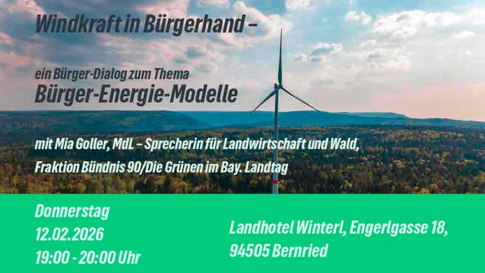Mia Goller und weitere Referenten stellen daher Bürger-Energie-Modelle vor, bei denen Bürger und Bürgerinnen, Landwirte und Kommunen selbst an Windkraft-Projekten teilhaben und regional profitieren können. Im Rahmen eines Bürger-Dialogs am 12.02.26 in Bernried sollen konkrete Beteiligungsmodelle vorgestellt und diskutiert werden, um Akzeptanz für die Energiewende durch echte Mitbestimmung zu schaffen
